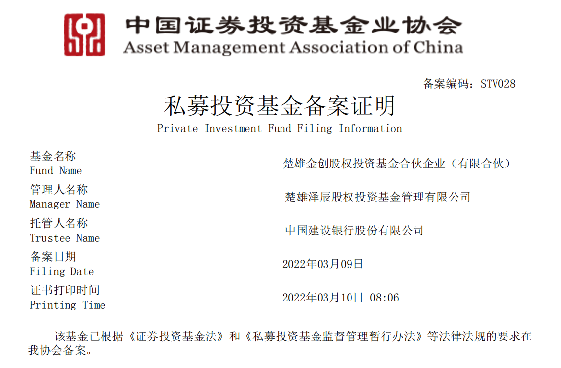 3月9日,云南產(chǎn)投公司與楚雄州金控資產(chǎn)管理有限公司共同發(fā)起設(shè)立的楚雄金創(chuàng)股權(quán)投資基金合伙企業(yè)(有限合伙)(以下簡(jiǎn)稱“楚雄金創(chuàng)基金”)成功完成中國(guó)證券投資基金業(yè)協(xié)會(huì)備案登記。