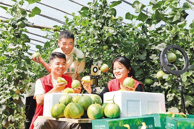 各地黨員、干部大力發(fā)揚密切聯(lián)系群眾的作風,立足崗位擔當作為、服務(wù)群眾。圖為2025年5月11日,河南省新鄉(xiāng)市延津縣南秦莊村甜瓜種植大棚內(nèi),黨員志愿者通過現(xiàn)場直播,幫助農(nóng)戶推銷甜瓜。 人民圖片 張燕/攝