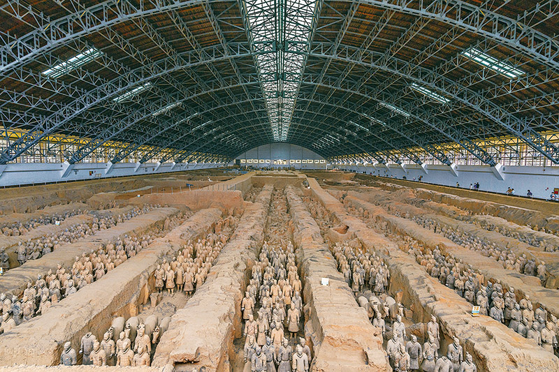 秦始皇陵是中國(guó)歷史上第一個(gè)多民族的中央集權(quán)國(guó)家的皇帝秦始皇于公元前246年至公元前208年?duì)I建的。作為秦始皇陵陪葬墓坑之一的兵馬俑坑于1974年被發(fā)現(xiàn),被譽(yù)為“世界第八大奇跡”。圖為秦始皇兵馬俑博物館一號(hào)坑全景。人民圖片 丁俊豪/攝