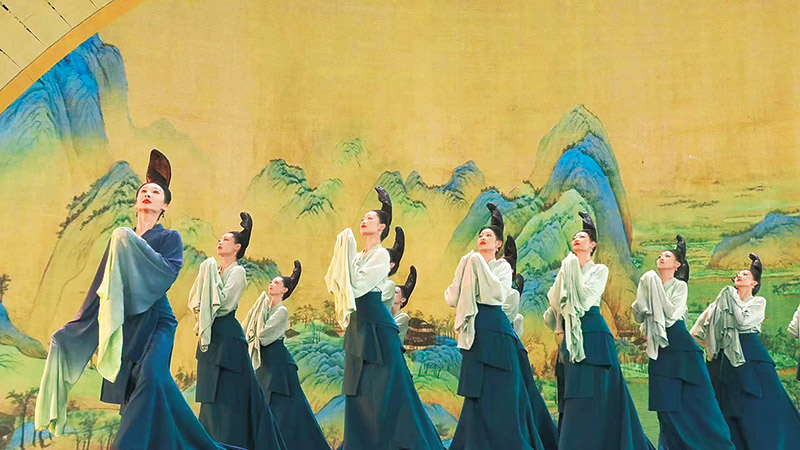 圖為圍繞傳世名作《千里江山圖》創(chuàng)排的舞蹈詩劇《只此青綠》亮相2022年中央廣播電視總臺(tái)春節(jié)聯(lián)歡晚會(huì)(視頻截圖)。中央廣播電視總臺(tái)供圖