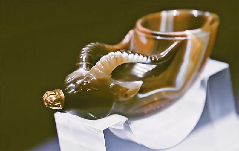 鑲金獸首瑪瑙杯的造型,與起源于古希臘的酒具“來通”相似,“來通”曾廣泛流行于中亞、西亞地區(qū),沿著絲綢之路不斷東傳進(jìn)入中國(guó),讓我們見證兩千余年來中華文明與絲綢之路沿線各國(guó)經(jīng)濟(jì)、文化交流的悠久歷史。圖為在陜西歷史博物館展出的鑲金獸首瑪瑙杯。新華社記者 李一博/攝