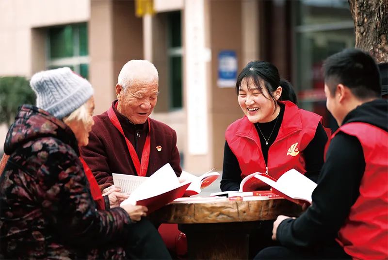 圖為2022年11月18日,山東省臨沂市郯城縣郯城街道“90后”青年黨員志愿者與龍泉社區(qū)“40后”老黨員一起學(xué)習(xí)黨的二十大精神。人民圖片 張春雷/攝