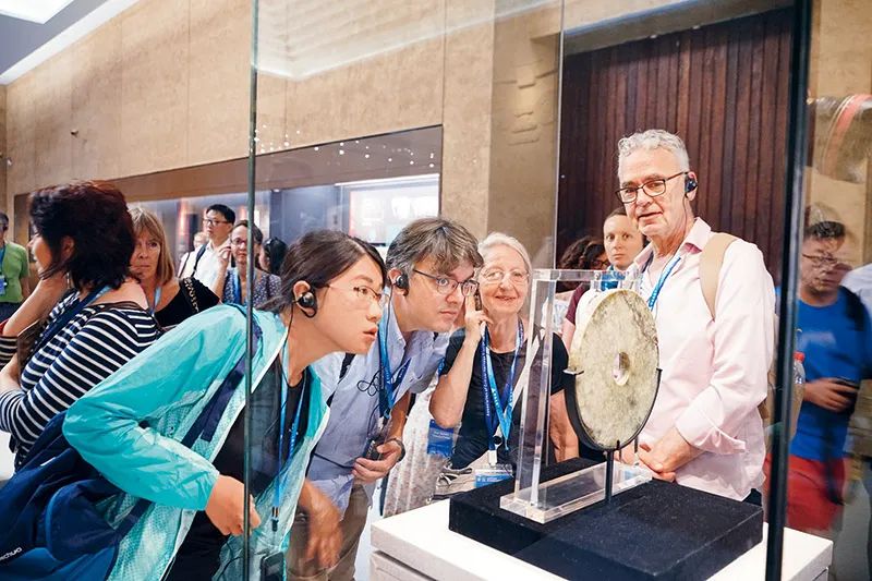 圖為第四屆文化遺產(chǎn)世界大會期間國際專家學者參觀良渚博物院?!×间静┪镌汗﹫D