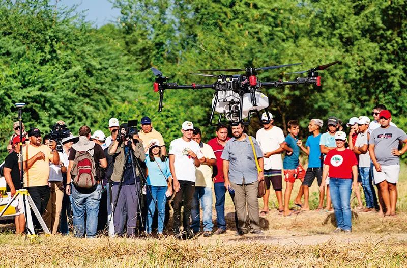 當(dāng)前,經(jīng)濟全球化動力和阻力膠著,但動力仍然勝過阻力。中國呼吁各方攜手推動普惠包容的經(jīng)濟全球化,更好惠及不同國家、不同群體。圖為2024年2月2日,在巴西阿波迪舉行的中巴農(nóng)業(yè)機械化合作示范項目啟動儀式上,人們觀看一款中國生產(chǎn)的農(nóng)用無人機。?新華社記者 王天聰/攝