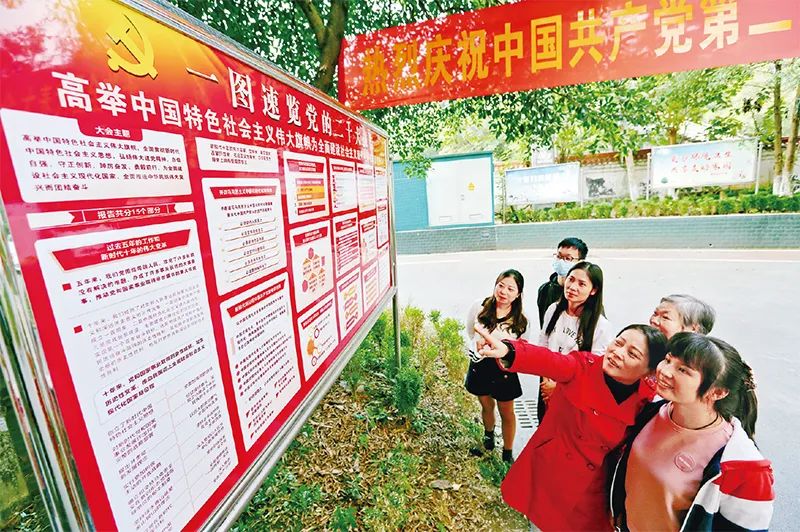 ?圖為2022年10月18日,重慶市萬盛經(jīng)開區(qū)東林街道清溪橋社區(qū),剛剛制作好的黨的二十大宣傳展板吸引了不少居民駐足閱覽,熱議并學(xué)習(xí)黨的二十大報告。 視覺中國 王瀘州/攝