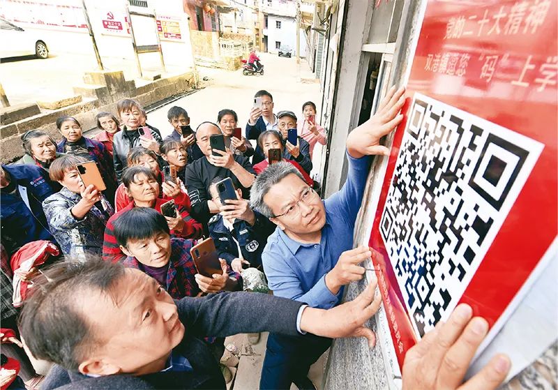 ?圖為2022年11月13日,江西省鄱陽縣雙港鎮(zhèn)黨員干部將宣講黨的二十大精神的二維碼貼在村頭,吸引不少村民前來掃碼學(xué)習(xí)了解有關(guān)知識。 中新社發(fā) 卓忠偉/攝