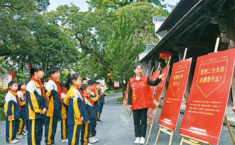 ?圖為2022年10月25日,浙江省臺州市上張鄉(xiāng)中心小學(xué)的學(xué)生在中共仙居縣委舊址紀(jì)念館學(xué)習(xí)黨的二十大精神。 人民視覺 王華斌/攝