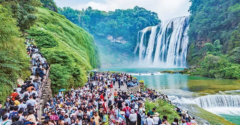 推動(dòng)高質(zhì)量發(fā)展,需要著力擴(kuò)大國(guó)內(nèi)需求,激發(fā)有潛能的消費(fèi)。圖為2023年10月3日,游客在貴州省安順市黃果樹瀑布景區(qū)游玩。新華社發(fā) 陳熙/攝