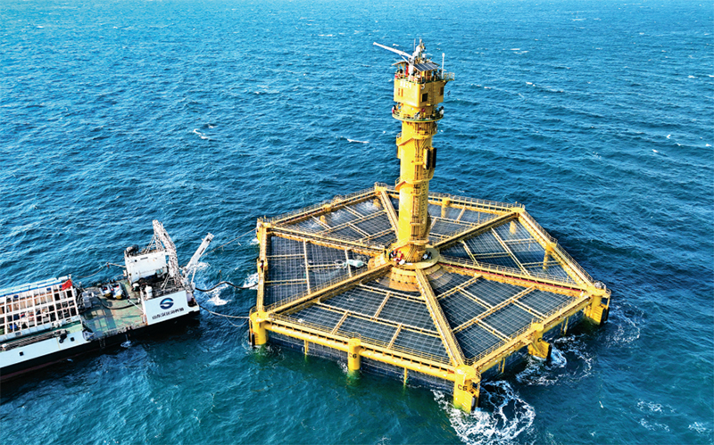 近年來(lái),我國(guó)在一些共性技術(shù)研發(fā)創(chuàng)新上不斷取得突破。圖右側(cè)為我國(guó)自主研制的大型全潛式深海智能漁業(yè)養(yǎng)殖裝備——“深藍(lán)2號(hào)”(2025年1月12日攝,無(wú)人機(jī)照片)。新華社記者 李紫恒/攝