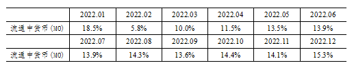 注4:自2022年12月起,“流通中貨幣(M0)”含流通中數(shù)字人民幣。12月末流通中數(shù)字人民幣余額為136.1億元。修訂后,2022年各月末M1、M2增速無明顯變化。修訂后M0增速如下: