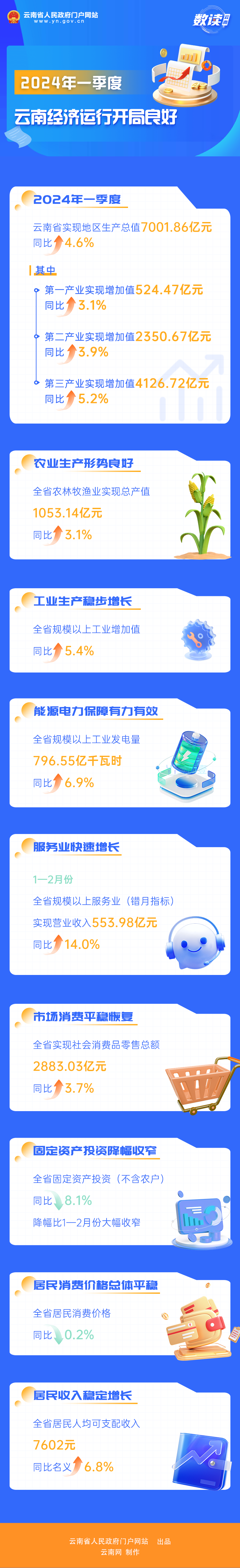 根據(jù)地區(qū)生產(chǎn)總值統(tǒng)一核算結(jié)果,2024年一季度云南省實現(xiàn)地區(qū)生產(chǎn)總值7001.86億元,同比增長4.6%。其中,第一產(chǎn)業(yè)實現(xiàn)增加值524.47億元,同比增長3.1%;第二產(chǎn)業(yè)實現(xiàn)增加值2350.67億元,增長3.9%;第三產(chǎn)業(yè)實現(xiàn)增加值4126.72億元,增長5.2%。