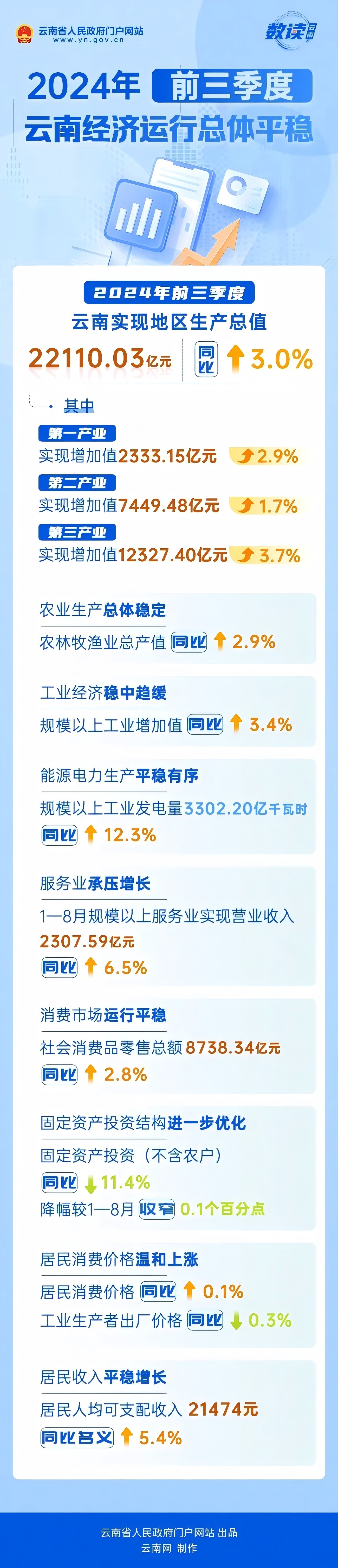 根據(jù)地區(qū)生產(chǎn)總值統(tǒng)一核算結(jié)果,2024年前三季度全省實(shí)現(xiàn)地區(qū)生產(chǎn)總值22110.03億元,同比增長3.0%。其中,第一產(chǎn)業(yè)實(shí)現(xiàn)增加值2333.15億元,同比增長2.9%;第二產(chǎn)業(yè)實(shí)現(xiàn)增加值7449.48億元,增長1.7%;第三產(chǎn)業(yè)實(shí)現(xiàn)增加值12327.40億元,增長3.7%。