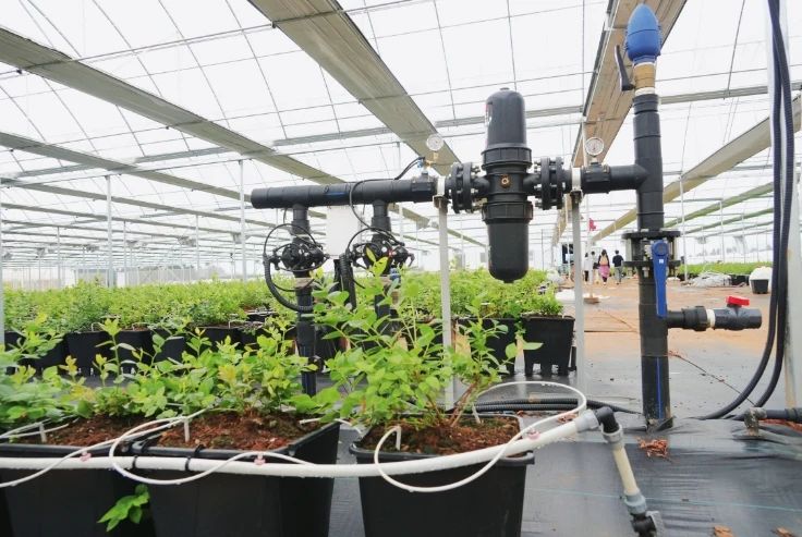園區(qū)打造了省內(nèi)領(lǐng)先的水肥一體化灌溉中心,引入全省首臺以色列5G智能施肥系統(tǒng),并配套兩臺4G施肥系統(tǒng),實現(xiàn)對約500畝藍(lán)莓基地的遠(yuǎn)程精準(zhǔn)水肥管控。通過智能監(jiān)測與動態(tài)調(diào)配,確保藍(lán)莓生長各階段精準(zhǔn)攝入所需營養(yǎng),有效促進(jìn)花芽發(fā)育與果實飽滿度提升,為高品質(zhì)產(chǎn)出提供核心技術(shù)支撐。自主開發(fā)光纖通信和物聯(lián)網(wǎng)智慧農(nóng)業(yè)平臺,空氣成分、風(fēng)力、溫度、濕度、pH值等數(shù)據(jù)通過傳感器接入平臺,平臺根據(jù)數(shù)據(jù)設(shè)定情況自主開關(guān)大棚通風(fēng)系統(tǒng)、遮陽系統(tǒng)、水肥灌溉等。