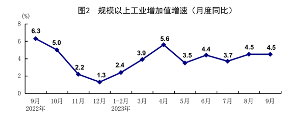 前三季度,全國(guó)規(guī)模以上工業(yè)增加值同比增長(zhǎng)4.0%,比上半年加快0.2個(gè)百分點(diǎn)。分三大門類看,采礦業(yè)增加值同比增長(zhǎng)1.7%,制造業(yè)增長(zhǎng)4.4%,電力、熱力、燃?xì)饧八a(chǎn)和供應(yīng)業(yè)增長(zhǎng)3.5%。裝備制造業(yè)增加值增長(zhǎng)6.0%,比全部規(guī)模以上工業(yè)快2.0個(gè)百分點(diǎn)。分經(jīng)濟(jì)類型看,國(guó)有控股企業(yè)增加值同比增長(zhǎng)4.6%;股份制企業(yè)增長(zhǎng)4.8%,外商及港澳臺(tái)商投資企業(yè)增長(zhǎng)0.5%;私營(yíng)企業(yè)增長(zhǎng)2.3%。分產(chǎn)品看,太陽能電池、充電樁、新能源汽車產(chǎn)量分別增長(zhǎng)63.2%、34.2%、26.7%。9月份,規(guī)模以上工業(yè)增加值同比增長(zhǎng)4.5%,增速與上月持平,比7月份加快0.8個(gè)百分點(diǎn);環(huán)比增長(zhǎng)0.36%。1-8月份,全國(guó)規(guī)模以上工業(yè)企業(yè)實(shí)現(xiàn)利潤(rùn)總額同比下降11.7%,降幅比上半年收窄5.1個(gè)百分點(diǎn),其中8月份同比增長(zhǎng)17.2%。9月份,制造業(yè)采購(gòu)經(jīng)理指數(shù)為50.2%,比上月上升0.5個(gè)百分點(diǎn),企業(yè)生產(chǎn)經(jīng)營(yíng)活動(dòng)預(yù)期指數(shù)為55.5%。