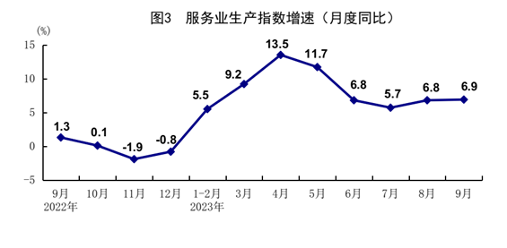 前三季度,服務(wù)業(yè)增加值同比增長(zhǎng)6.0%。其中,住宿和餐飲業(yè),信息傳輸、軟件和信息技術(shù)服務(wù)業(yè),租賃和商務(wù)服務(wù)業(yè),交通運(yùn)輸、倉(cāng)儲(chǔ)和郵政業(yè),金融業(yè)增加值分別增長(zhǎng)14.4%、12.1%、9.5%、7.5%、7.0%。9月份,服務(wù)業(yè)生產(chǎn)指數(shù)同比增長(zhǎng)6.9%,比上月加快0.1個(gè)百分點(diǎn),增速連續(xù)2個(gè)月回升。其中,住宿和餐飲業(yè),信息傳輸、軟件和信息技術(shù)服務(wù)業(yè),交通運(yùn)輸、倉(cāng)儲(chǔ)和郵政業(yè)生產(chǎn)指數(shù)分別增長(zhǎng)17.7%、11.3%、9.3%。1-8月份,全國(guó)規(guī)模以上服務(wù)業(yè)企業(yè)營(yíng)業(yè)收入同比增長(zhǎng)7.2%。9月份,服務(wù)業(yè)商務(wù)活動(dòng)指數(shù)為50.9%,比上月上升0.4個(gè)百分點(diǎn);業(yè)務(wù)活動(dòng)預(yù)期指數(shù)為58.1%。其中,水上運(yùn)輸、郵政、電信廣播電視及衛(wèi)星傳輸服務(wù)、互聯(lián)網(wǎng)軟件及信息技術(shù)服務(wù)、貨幣金融服務(wù)等行業(yè)商務(wù)活動(dòng)指數(shù)位于55.0%以上較高景氣區(qū)間。