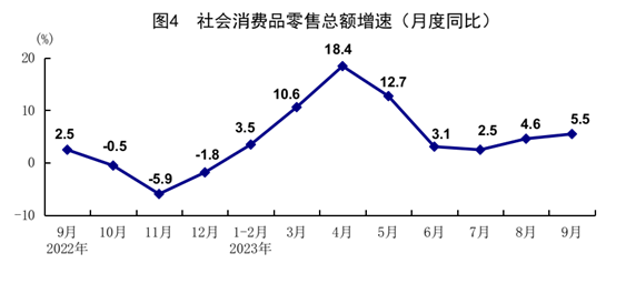前三季度,社會(huì)消費(fèi)品零售總額342107億元,同比增長(zhǎng)6.8%。按經(jīng)營(yíng)單位所在地分,城鎮(zhèn)消費(fèi)品零售額296410億元,同比增長(zhǎng)6.7%;鄉(xiāng)村消費(fèi)品零售額45697億元,增長(zhǎng)7.4%。按消費(fèi)類型分,商品零售305002億元,增長(zhǎng)5.5%;餐飲收入37105億元,增長(zhǎng)18.7%?;旧铑惿唐蜂N售穩(wěn)定增長(zhǎng),限額以上單位服裝鞋帽針紡織品類、糧油食品類商品零售額分別增長(zhǎng)10.6%、5.3%。升級(jí)類商品銷售較快增長(zhǎng),限額以上單位金銀珠寶類、體育娛樂用品類、化妝品類商品零售額分別增長(zhǎng)12.2%、8.3%、6.8%。全國(guó)網(wǎng)上零售額108198億元,同比增長(zhǎng)11.6%。其中,實(shí)物商品網(wǎng)上零售額90435億元,增長(zhǎng)8.9%,占社會(huì)消費(fèi)品零售總額的比重為26.4%。9月份,社會(huì)消費(fèi)品零售總額同比增長(zhǎng)5.5%,比上月加快0.9個(gè)百分點(diǎn),增速連續(xù)2個(gè)月加快;環(huán)比增長(zhǎng)0.02%。前三季度,服務(wù)零售額同比增長(zhǎng)18.9%。