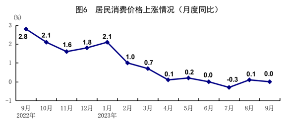 前三季度,全國(guó)居民消費(fèi)價(jià)格(CPI)同比上漲0.4%。分類別看,食品煙酒價(jià)格上漲1.1%,衣著價(jià)格上漲0.9%,居住價(jià)格下降0.1%,生活用品及服務(wù)價(jià)格上漲0.2%,交通通信價(jià)格下降2.4%,教育文化娛樂價(jià)格上漲1.9%,醫(yī)療保健價(jià)格上漲1.1%,其他用品及服務(wù)價(jià)格上漲3.2%。在食品煙酒價(jià)格中,豬肉價(jià)格下降6.8%,鮮菜價(jià)格下降3.1%,糧食價(jià)格上漲1.2%,鮮果價(jià)格上漲6.0%??鄢称泛湍茉磧r(jià)格后的核心CPI同比上漲0.7%。9月份,全國(guó)居民消費(fèi)價(jià)格同比持平,環(huán)比上漲0.2%。